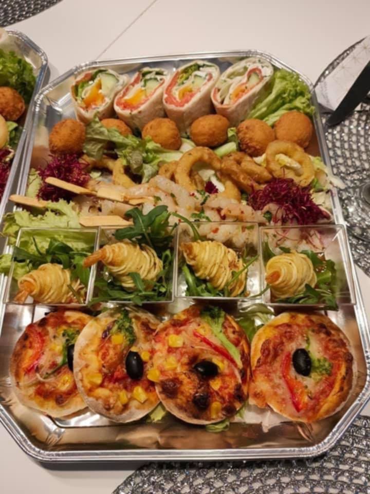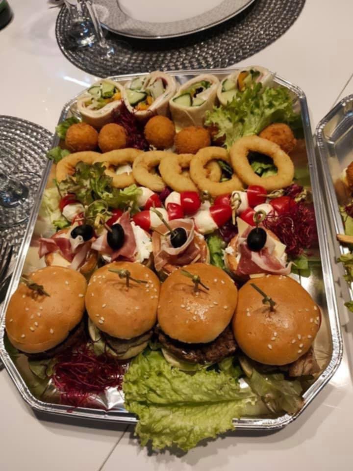 4x mini burgery z wołowiną, 4x volevanty z ciasta francuskiego faszerowane kremowym serkiem,szynka, żółtym serem i oliwka, 8xkoreczki z pomidorków,, szynki i oliwki6xkrążki cebulowe w cieście,6xpanierowane snaksy z papryczka Jalapeno i kremowym serkiem,4xrolki z tortilli(kremowy serek,szynka,ser,warzywa) razem 32 szt plus dwa sosy czosnkowy i słodko-pikantny