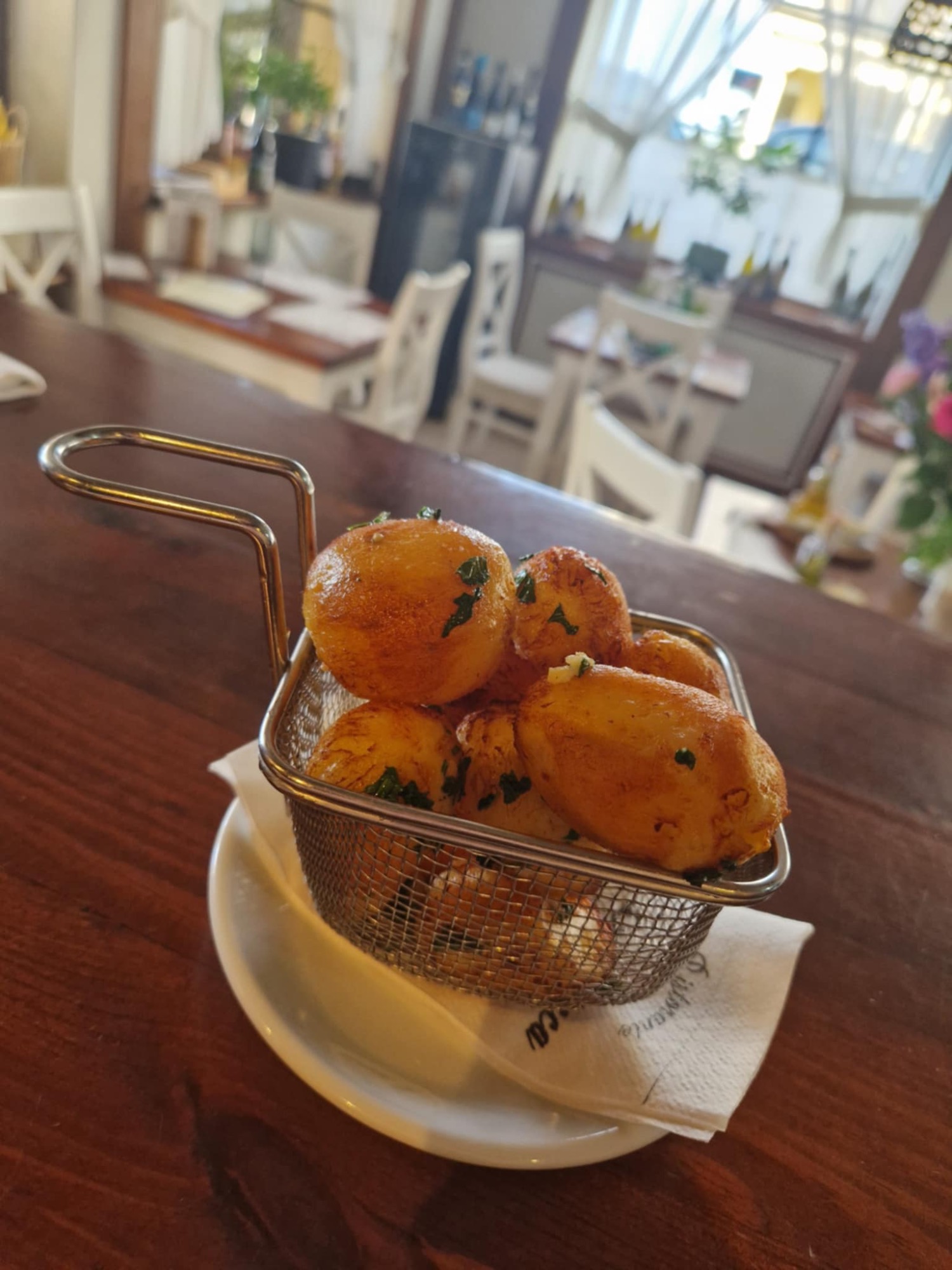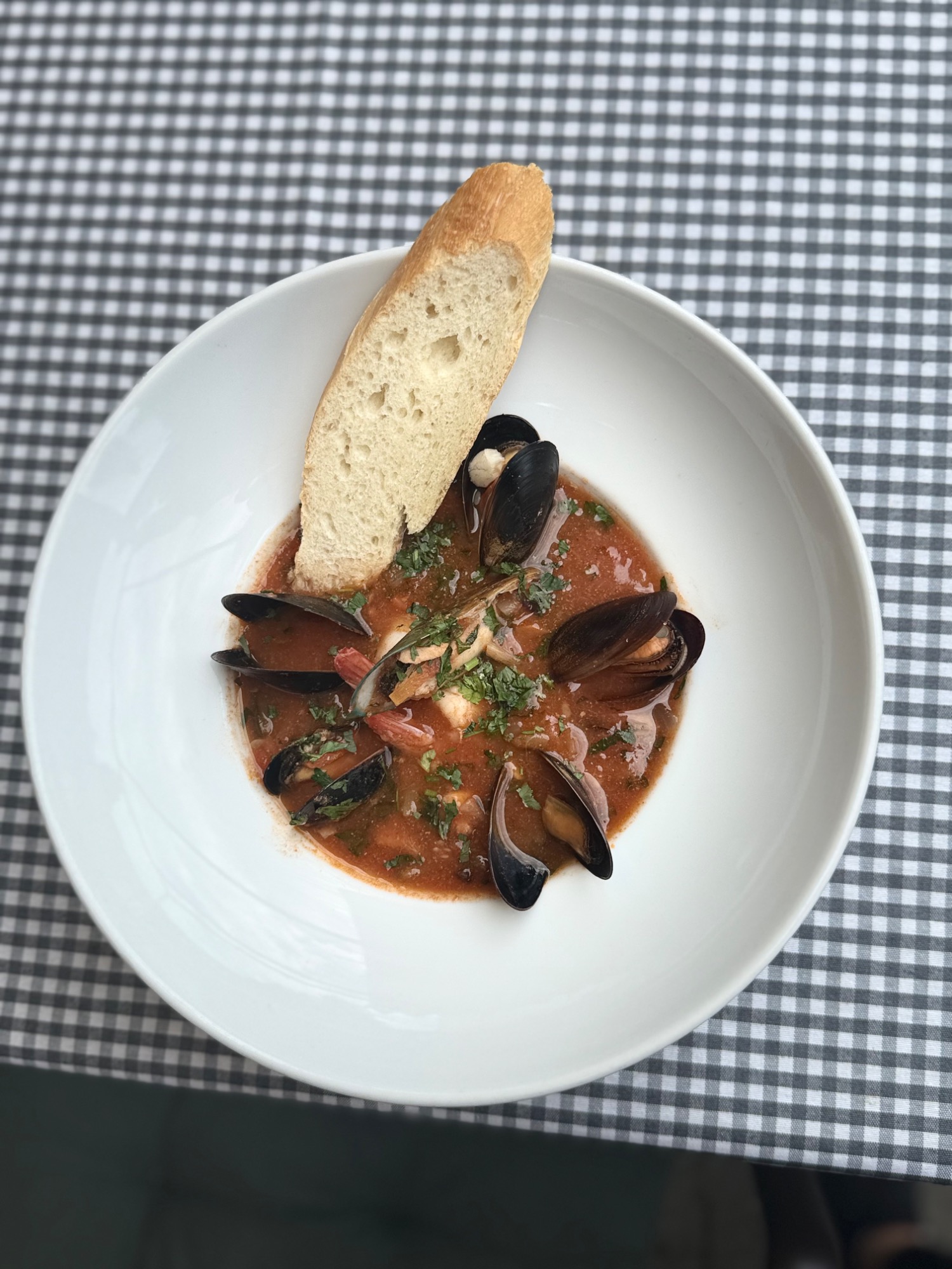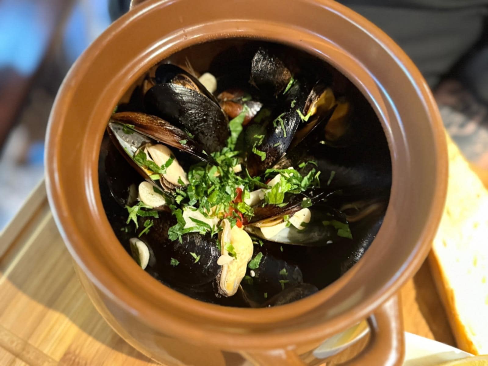 Małże hiszpańskie duszone w białym winie na maśle z czosnkiem i pietruszką podane w garnuszku pod przykryciem z pieczywem własnego wypieku - polecane dla 2 osób / Spanish mussels stewed in white wine with butter, garlic and parsley, served in a pot with homemade bread - recomended for 2 people
