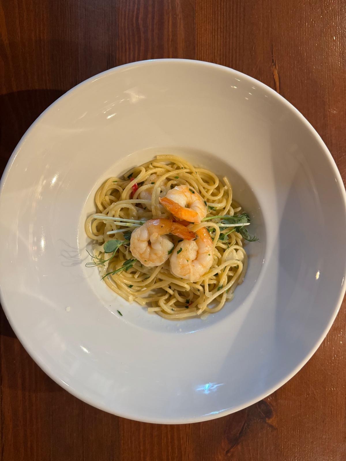 Spaghetti z krewetkami Black Tiger, na oliwie z czosnkiem, papryczką chilli i świeżymi ziołami oprószone Grana Padano / Spaghetti with Black Tiger prawns in olive oil and garlic, chilli pepper and fresh herbs with Grana Padano