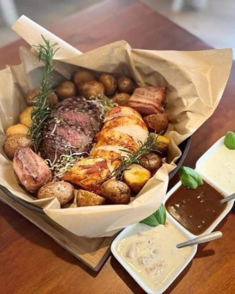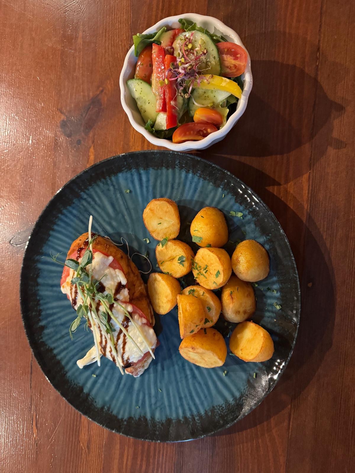 Polędwiczki wieprzowe, polędwica wołowa , pierś z kurczaka , podane z trzema sosami .opiekanymi ziemniakami oraz sałatką ze świeżych warzyw / Pork loins x2, beef loin x2, chicken breast x2 served with 3 sauces, roadster potatoes and fresh vegetable salad