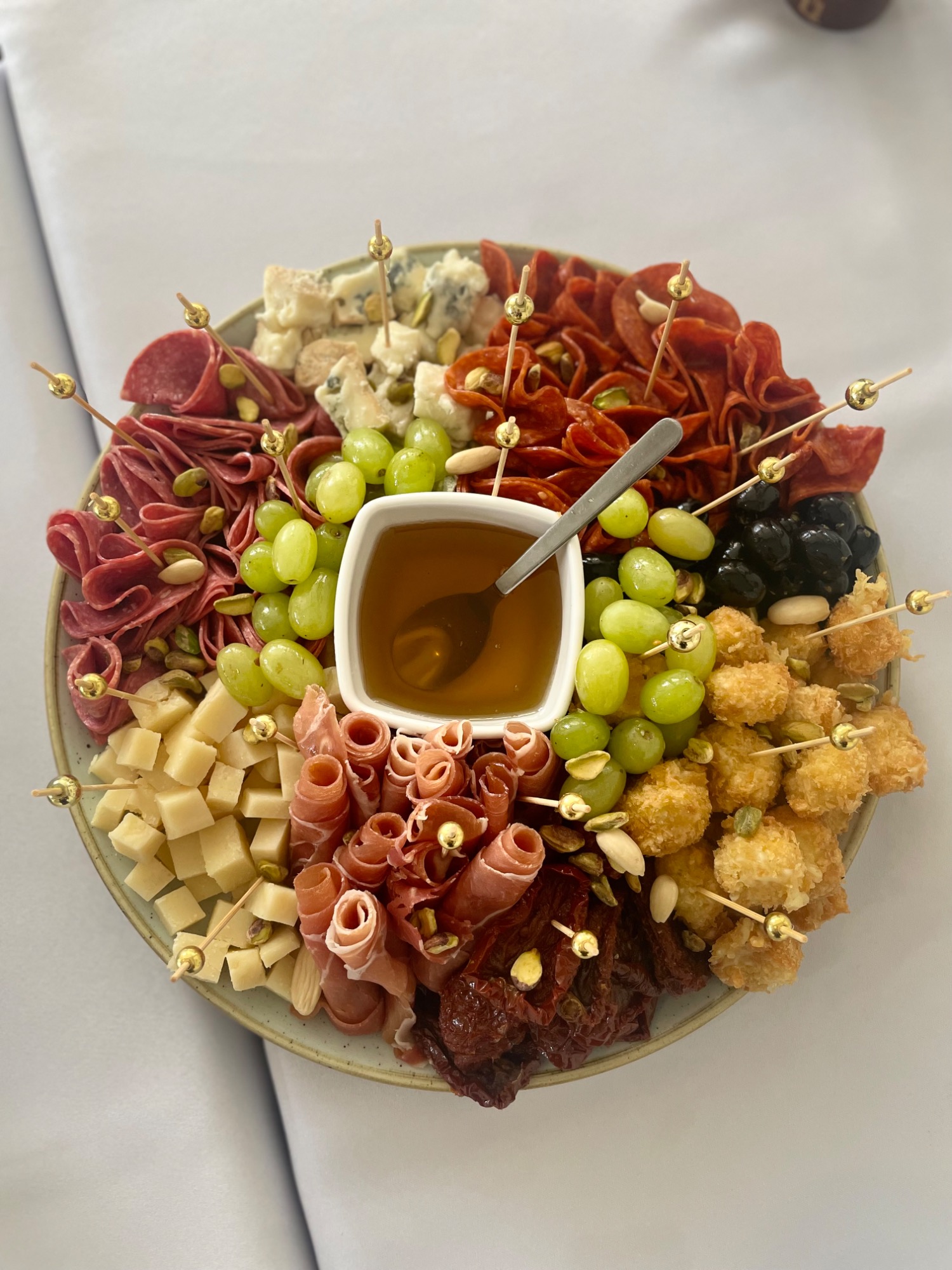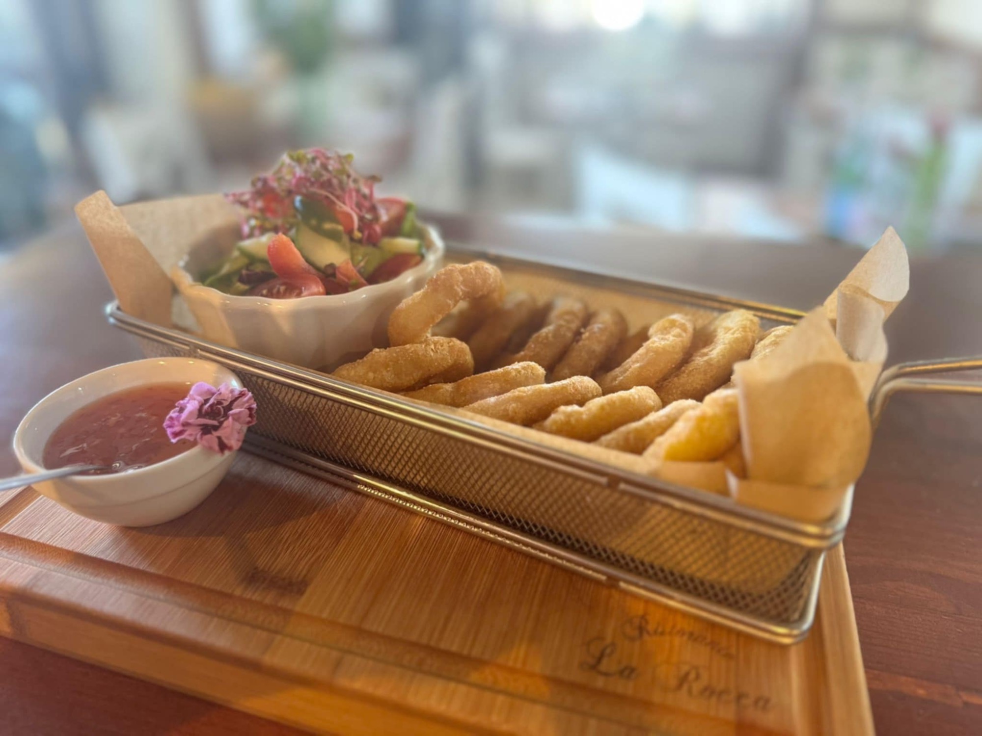 4xkrewetka w cieście serwowana z Rucola i pikantnym sosem, 4xmini pizzerinki z warzywami i szynka,4xrolki z tortilli z łososiem (z kremowym serkiem,rucolą i świeżym ogórkiem,4xkrewetkowy szaszłyk z czosnkiem i chilli, 4x krążki kalmarów w cieście 4xpanierowane snaksy z papryczka Jalapeno i kremowym serkiem. Razem 24 szt plus dwa sosy czosnkowy i słodko-pikantny -