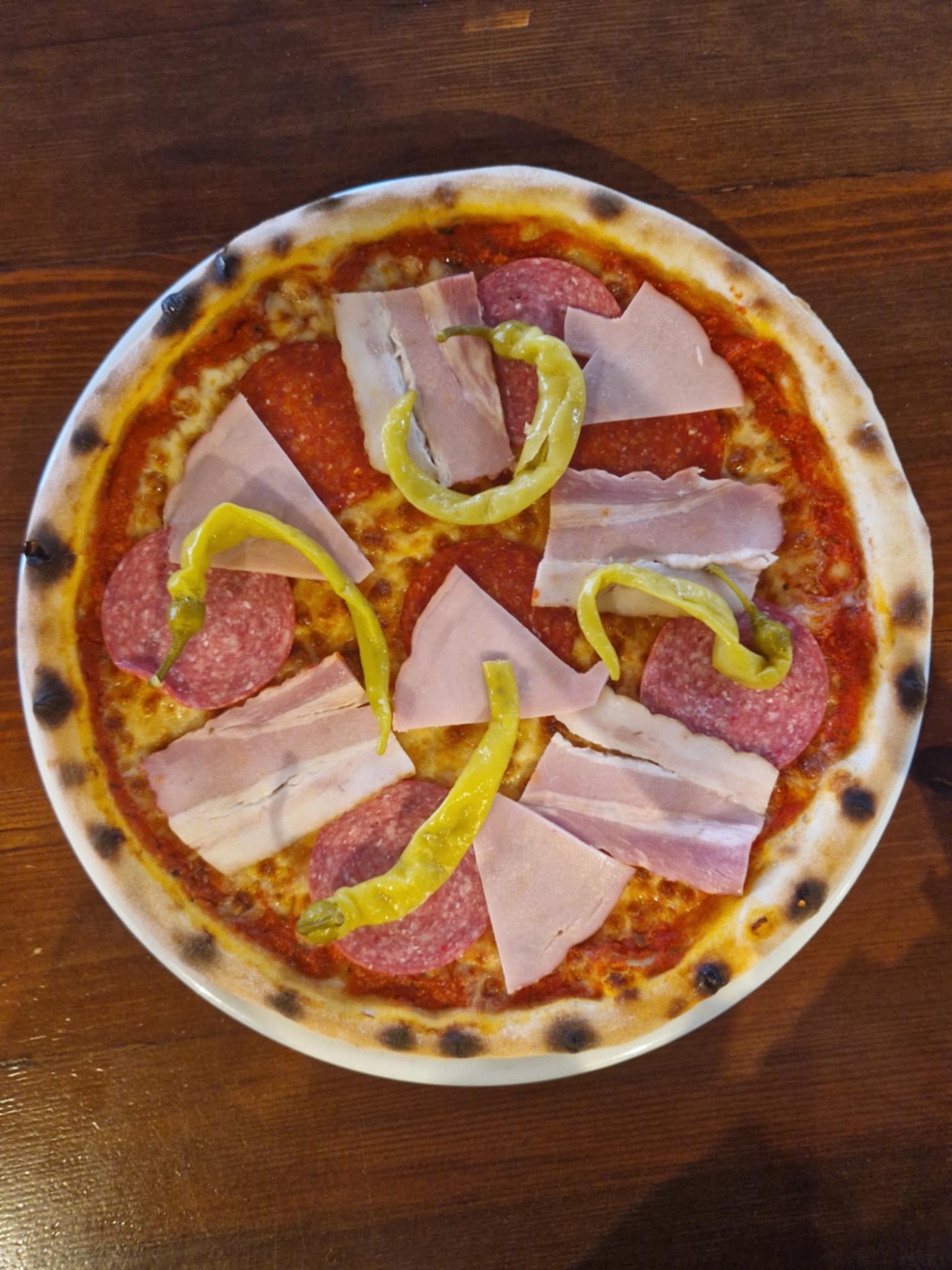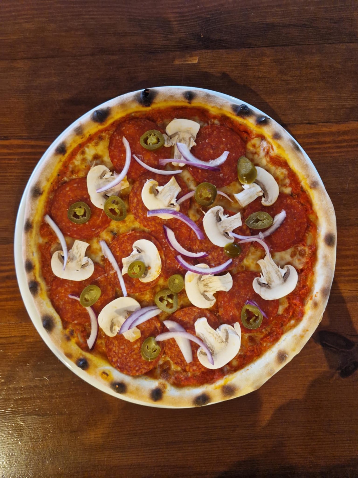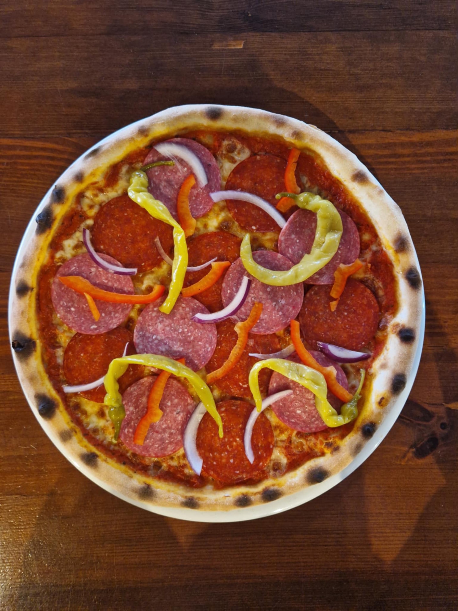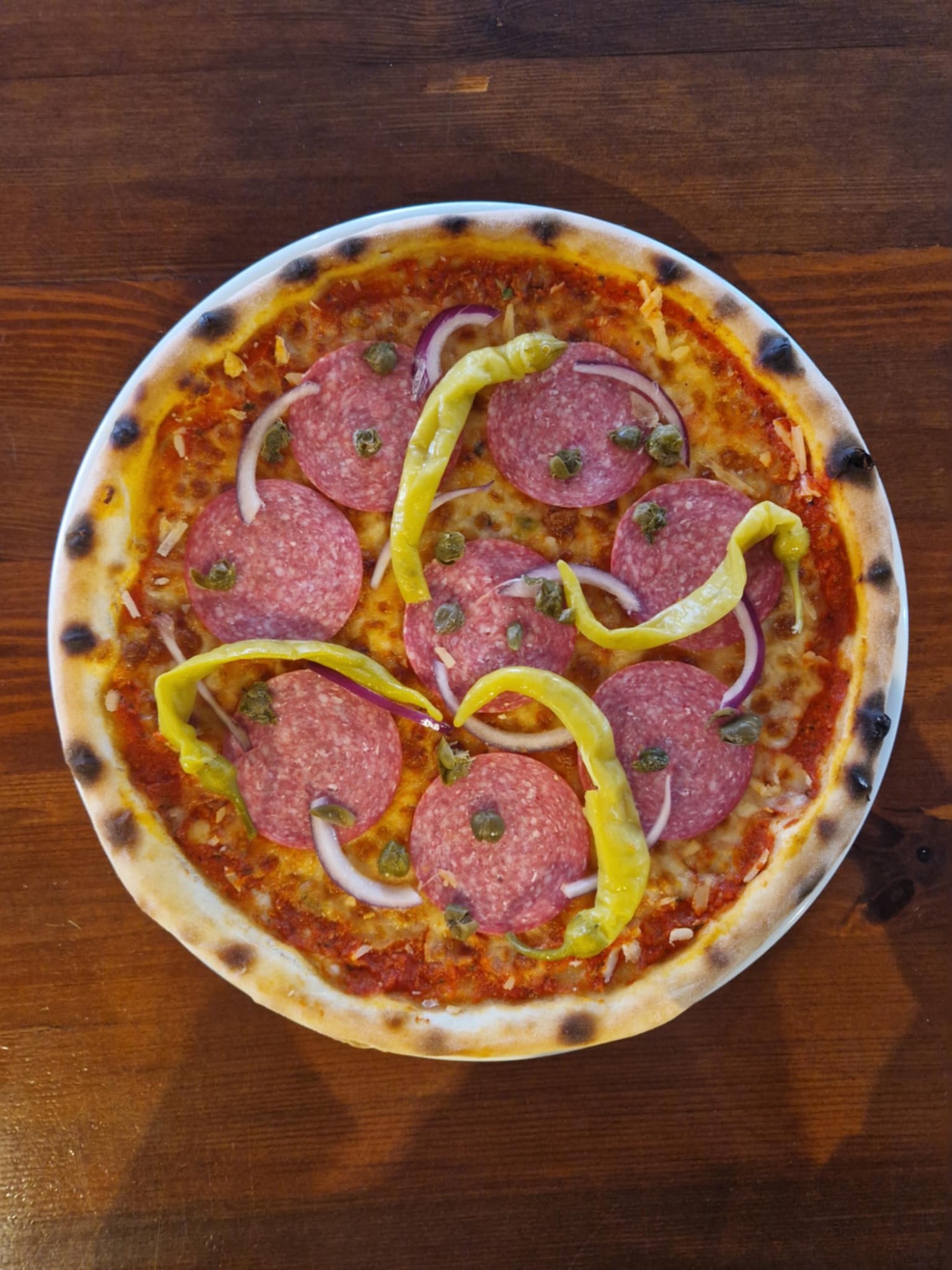 sos pomidorowy, ser mozzarella, salami, czosnek, kapary, łagodna papryka peperoni, cebula