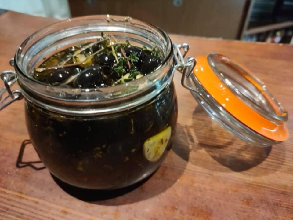 Słoik włoskich oliwek w oliwie z czosnkiem z ziolami