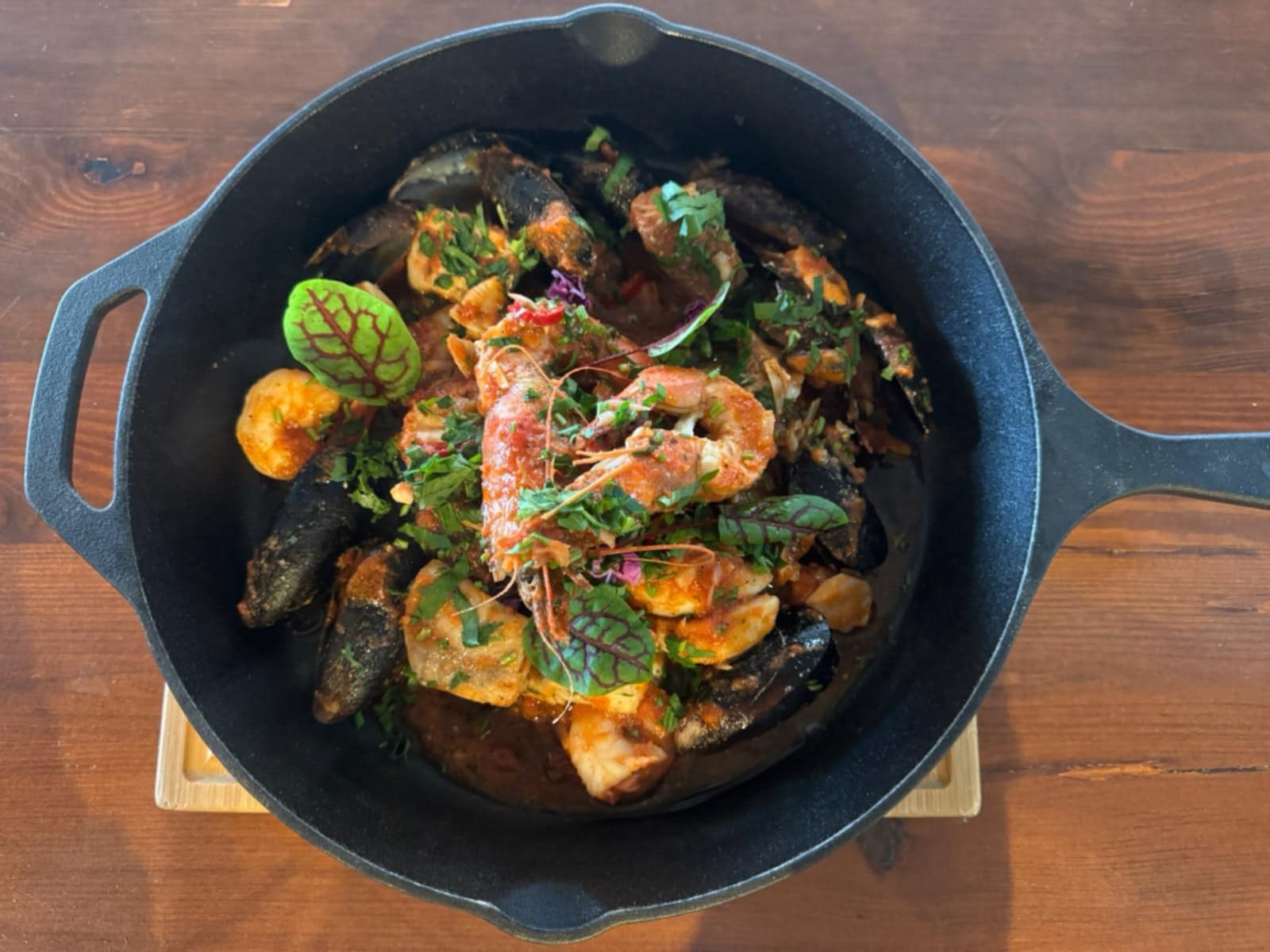 podany z pieczywem naszego wypieku (kalmar, dorsz, krewetka 8/12 2 szt, krewetki 16/20 4 szt, małże nowozelandzkie 2 szt, małże w skorupie 14 szt) 500 gr/served with homemade bread (squid, codfish, shrimps 8/12 -2 ps, shrimps 16/20-4 ps, shellfishes New zealander-2 ps, mussels- 14 ps)